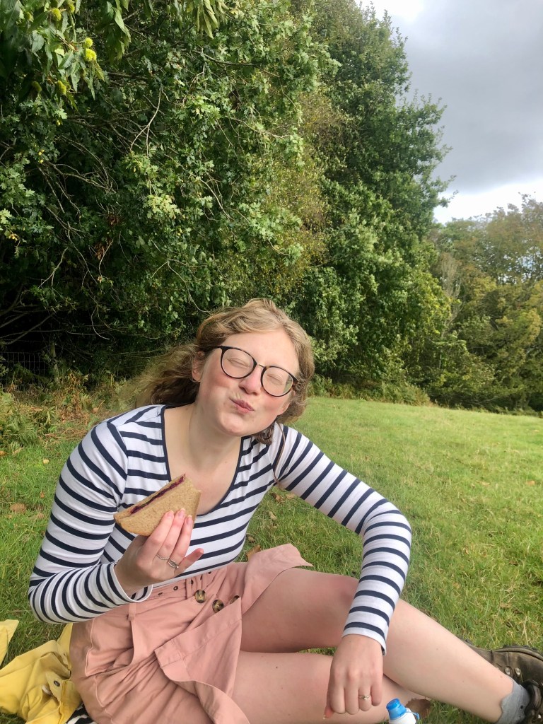 However, we weren’t out of the woods (pun intended) yet, and this tricky section of the walk continued to throw up problems, this time of our own making. Walking along, I suddenly noticed that my back was wet, and not in a sweaty way! Upon inspection, we found that one of the drinks bottles had leaked and the inside of the bag smelt of summer fruits. Once the bottle cap had been screwed on properly, we found the path led us to another short, but muddy section. After carefully ascending, we came out onto another farmer’s field, which felt like a good opportunity to stop for lunch after a slightly difficult mile.