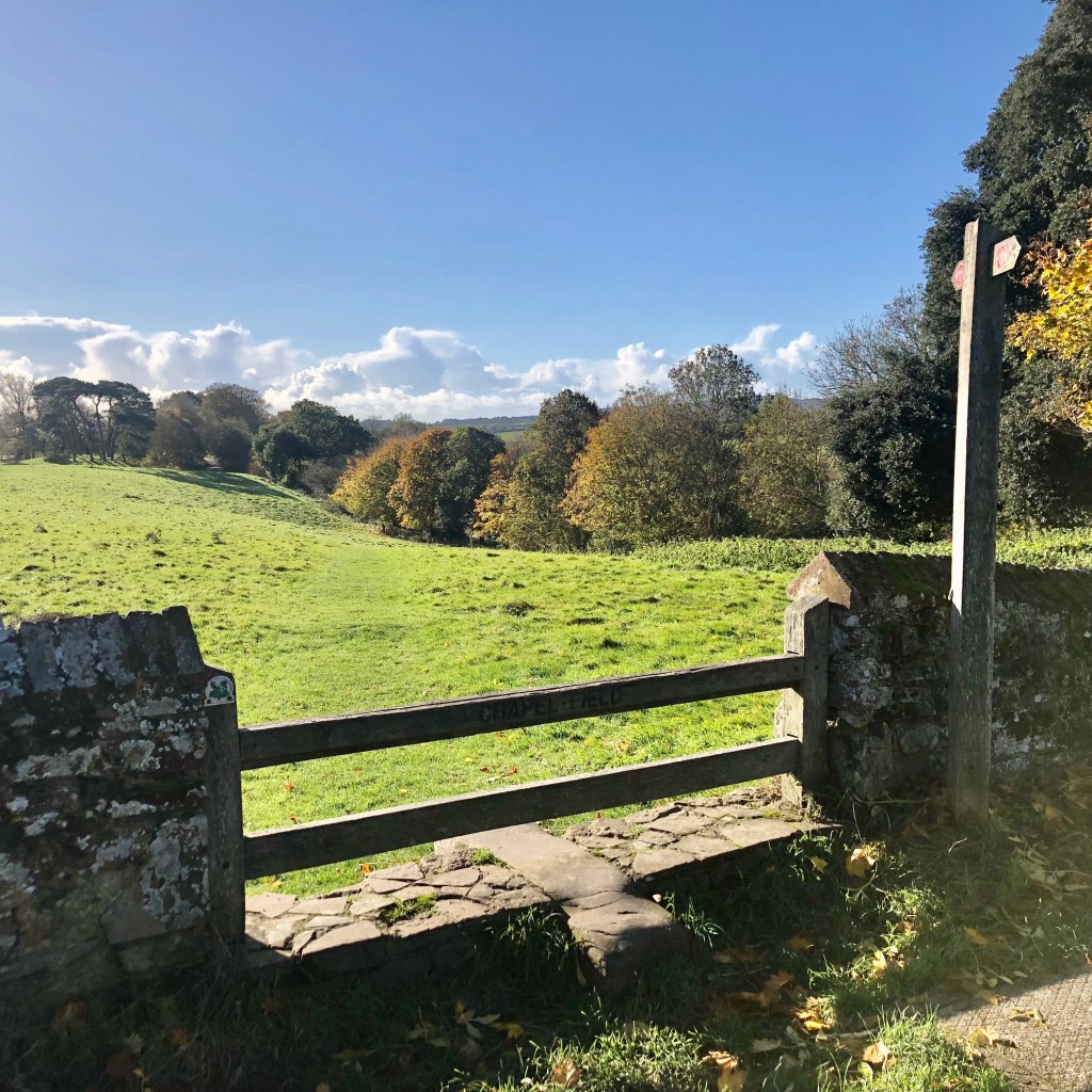 The footpath led out and across inviting countryside, which thankfully turned out to be less water-logged than we might have expected. We headed up and across several fields, containing a range of young cattle and a large flock of sheep, before reaching the top of the long slope, where we were greeted with bright views of the English Channel reflecting the low-hanging Autumn sun. From there the path dips a little down to the road before heading back uphill across a field past a converted windmill, then down and out through the opposite corner back to the road. We then walked along the narrow country road for a short spell before reaching a crossroads, where the next footpath awaited us.
