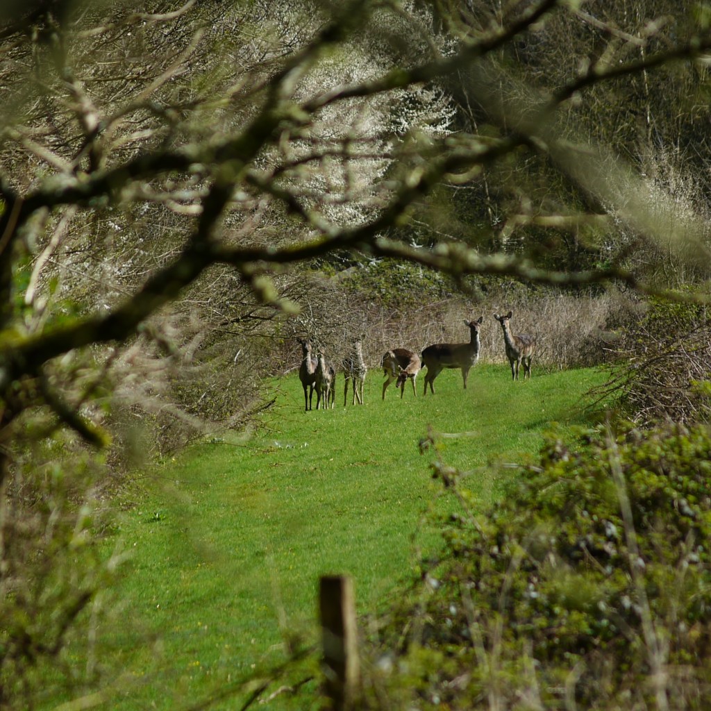 Anyhow, once you are past the eyesore, the walk then gives up one of my favourite stretches of footpath in the whole of the Southeast; a gentle downhill slope through a small woods, and the place where I first realised how much I liked finding wild garlic on our adventures (and here, the plant thrives). We started to think we had perhaps arrived a week or so too early, however as we looked closely we were able to spot a couple of wild garlic flowers in bloom, as well as a few early-rising bluebells, amongst a scattering of other colourful spring flowers. As the sun shone through the still-bare branches, I got my first waft of the wild garlic on a gentle, warm woodland breeze. The birds were all in song as three Blue Tits came tumbling out of the sky right in front of us, squabbling over some scrap of food or nesting material. Not only this, but as we made our way through the trees, we were lucky enough to spot through a gap in the woods, a small herd of large deer, staring in our direction. Were they the same deer as earlier? Of course, we can’t know for sure, but they were headed in this direction and were a similar size and colour – this time, fortunately, no dog in pursuit. No more than a couple of hundred yards long, this stretch of dappled woodland has so much to offer.