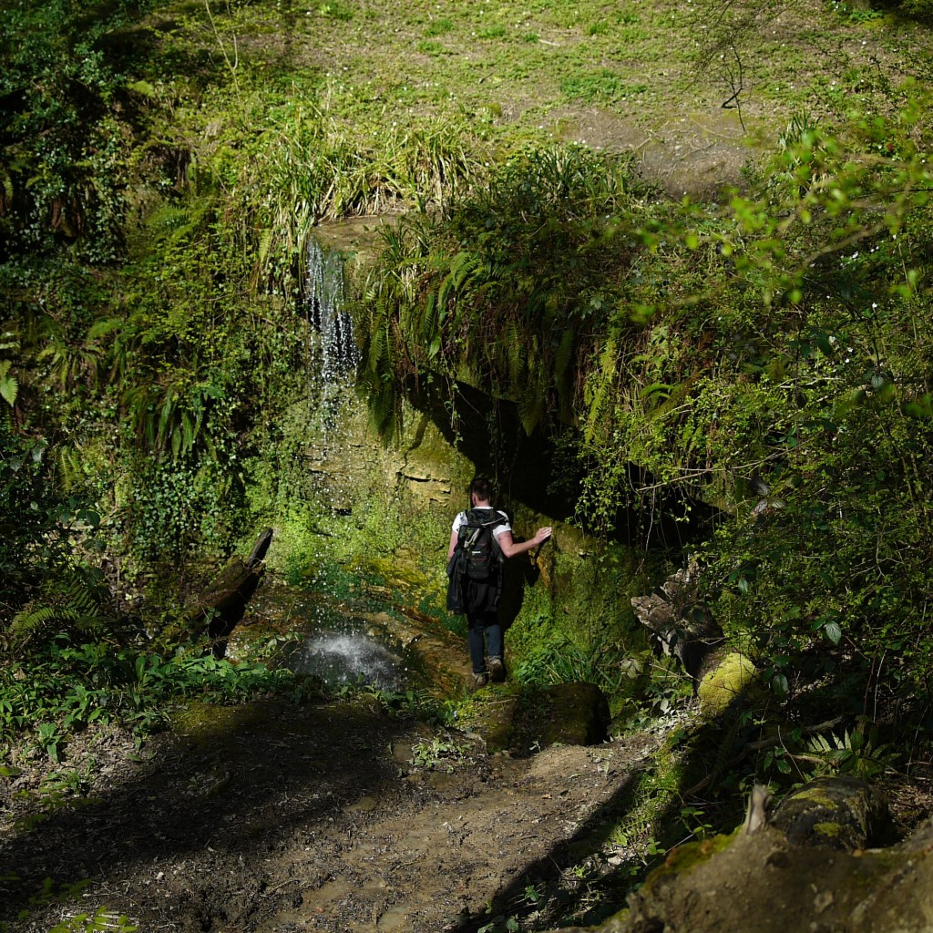 Once at the top of the hill, you arrive at a barn, and face a choice. The route home lies straight ahead, however there is also an optional path to the left, which takes you to ‘The Devil’s Leap’, a small woodland waterfall, which, there and back, adds 20-30 minutes to your day. We have always chosen to do so, but is it worth it? Of course it is, even if only for the extra walking opportunity (after all, why are we here?). However, this little addition adds lots to the day. The trail initially takes you downhill for a minute to cross a small stream, before turning left through a picture-perfect woodland to follow the stream’s edge, which slowly falls away into a valley as your path rises through a scene of glowing mosses and bluebells. If heaven on earth exits, to me, this is pretty close.