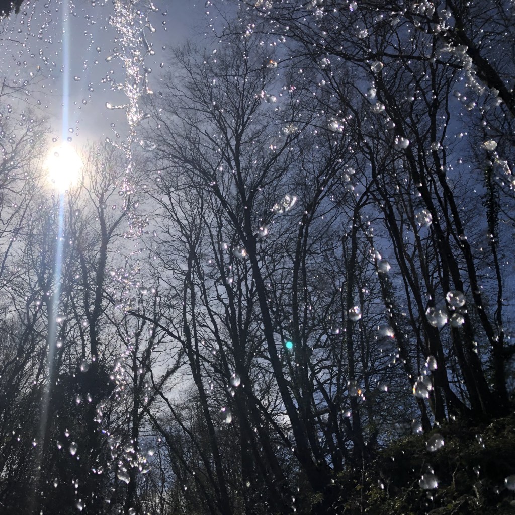 Anyhow, it was a learning experience, and the Devil’s Leap now lay just ahead. In dryer weather, the waterfall is little more than a trickle, and I suppose is somewhat underwhelming as a destination (but remember of course, it is all about the journey). Today however, it was flowing quite nicely and we got a rare combination of a splashing waterfall and a sunny day. I carefully made my way down to stand behind it and feel the water, whilst Beth and Pumpkin waited back up on the track (the route down was a little too slippery).
