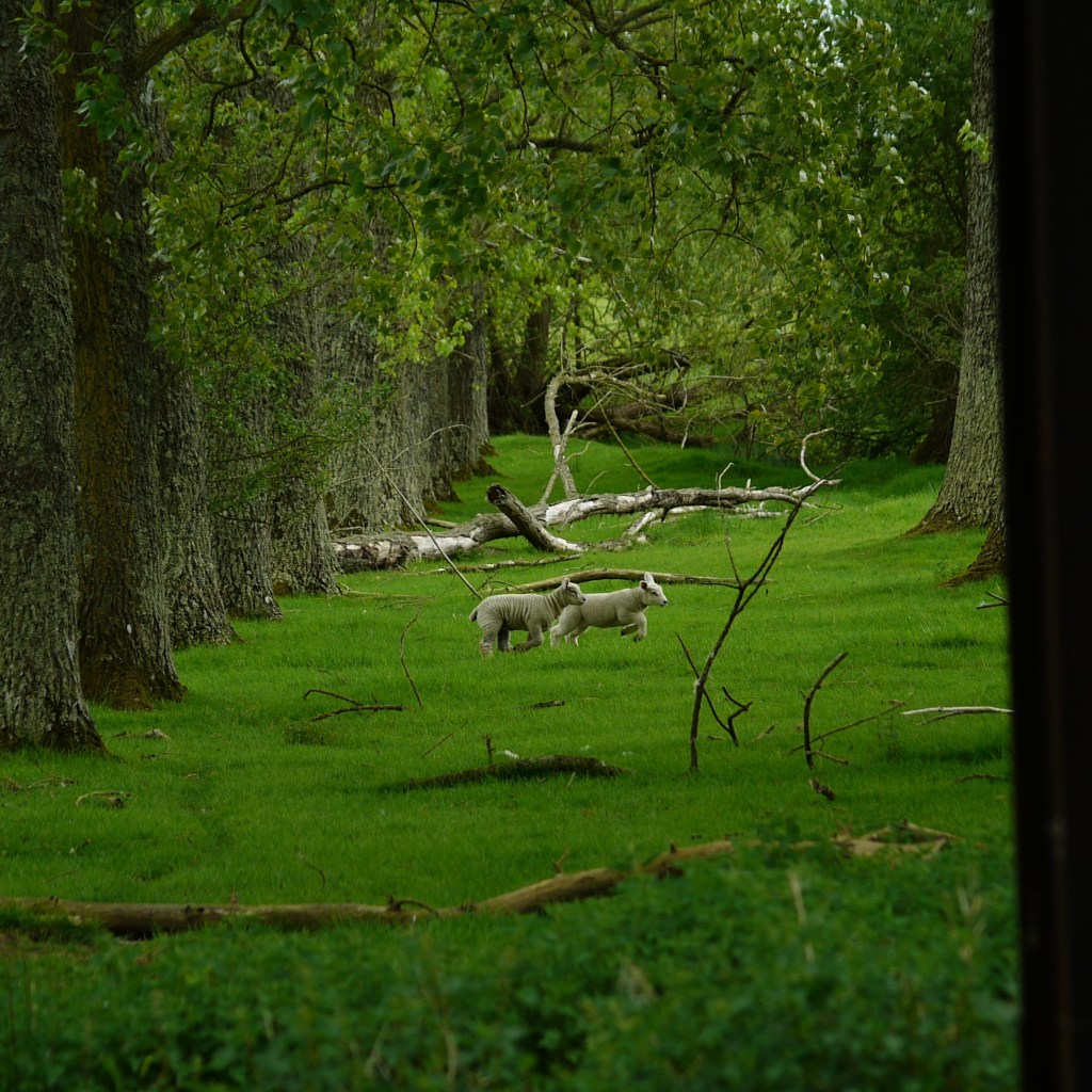 A few minutes of tree-lined path which is often muddy leads back out onto open, rugged land, before another tree-lined path then appears on the right, and continues to run along the same trajectory. Today we found that the brightness of the day had seeped through the new leaves and made the soft carpet of moss amongst the roots glow. Another stile then comes up on the right, which takes you out into a hilltop field with a good view stretching back out to the castle in the distance, before descending back down through the farm yard. This next short stretch is often not the prettiest of the day, but then it is a working farm and only lasts a couple of minutes before you are back on the footpath.