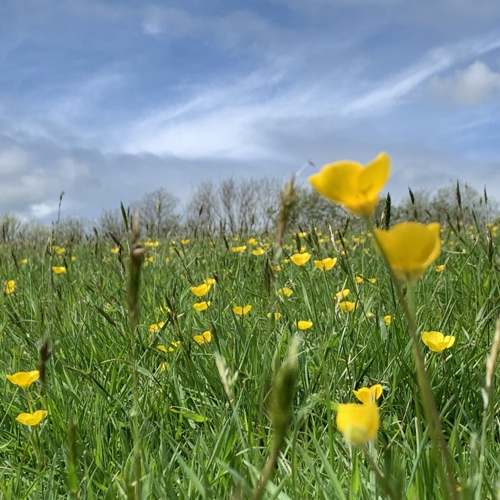 Once around the edge of the first field and across the usually quiet rail line, the castle disappeared behind us as we found ourselves in a small patch of trees, amongst which a group of lambs frolicked, alongside their more mellow mothers. Another stile led us out into a large field beyond where we walked through more dozing and suckling lambs, whose bleats continued to line our path as we made our way steadily up through a series of fields until we came out onto a quiet road. From here we continued to meander up past some pretty cottages, before another stile appeared to the left, leading us out across another stretch of wide, open farmland. These fields are usually full of lambs and pregnant ewes, although on this occasion there weren’t quite as many. We were still treated with a small herd all the same and walked through a field sprouting with golden buttercups, before crossing another road.