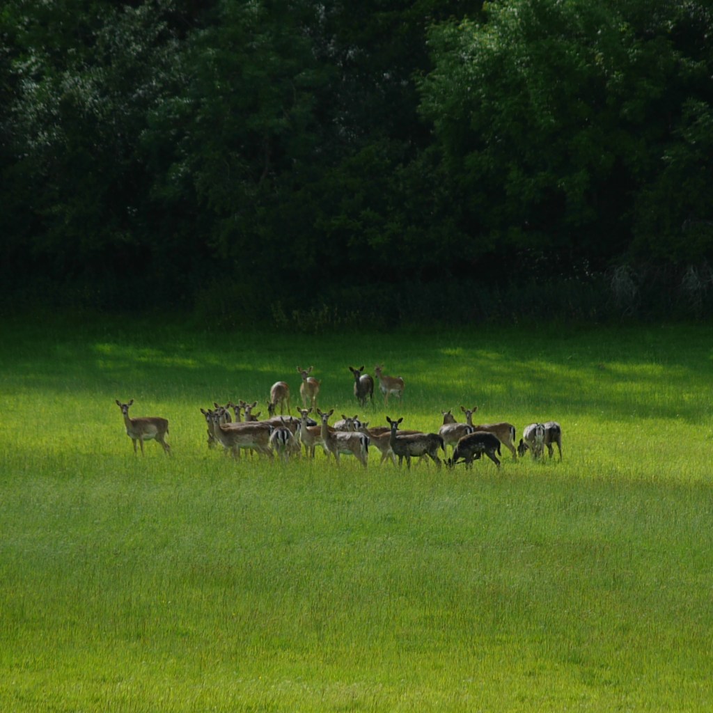 After coming out at a road and putting the farm behind, we eventually crossed into the day’s next patch of woodland, where we continued to talk about all things cattle, and Beth even accidentally admitted that the whole thing had been ‘exciting’ after all – progress! Coming back out into the open to another wide swathe of fast-growing meadow, we made our way over a crest and halted when we spotted a herd of deer happily grazing amongst the warm long grass. They must be here often as we had seen some last time too, and on this occasion they only ran a little away when they spotted us, being happy to remain amongst the shade at the edge of the field and watch us pass through whilst munching away, rather than running away entirely.