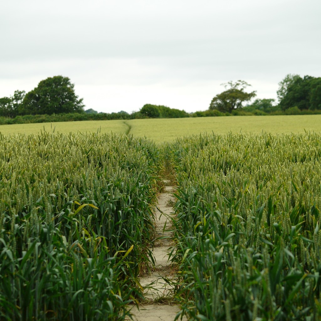We made our way along the edge of an uncut field where a small whirl of dust swirled in the light, but welcome breeze. The track led us away from the mass of trees behind us, and eventually steeply upward for a minute before we emerged onto a farmyard with a spattering of cottages. On our last attempt, we had somehow managed to get completely lost here, going the wrong way twice, once even being told off for being on private property (whoops!). Fortunately we had learned from our mistakes and didn’t go the wrong way a third time, but did instead get run at by a handful of barking dogs. Happily, they were all bark and no bite, so we made it out alive and walked up past more cottages to the main road, and back over the other side.