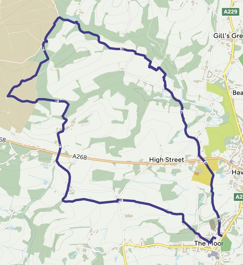 Returning to a more familiar walk than recent weeks, on this particularly overcast, muggy Sunday, we chose to tackle a walk we had done before, starting from the village green on Hawkhurst’s ‘moor side’, swinging out and around to the edges of the Bedgebury Forest. This was, however, one of the routes whose instructions we had failed to save before they vanished from the internet, so would be completing it from a combination of memory and the OS app.