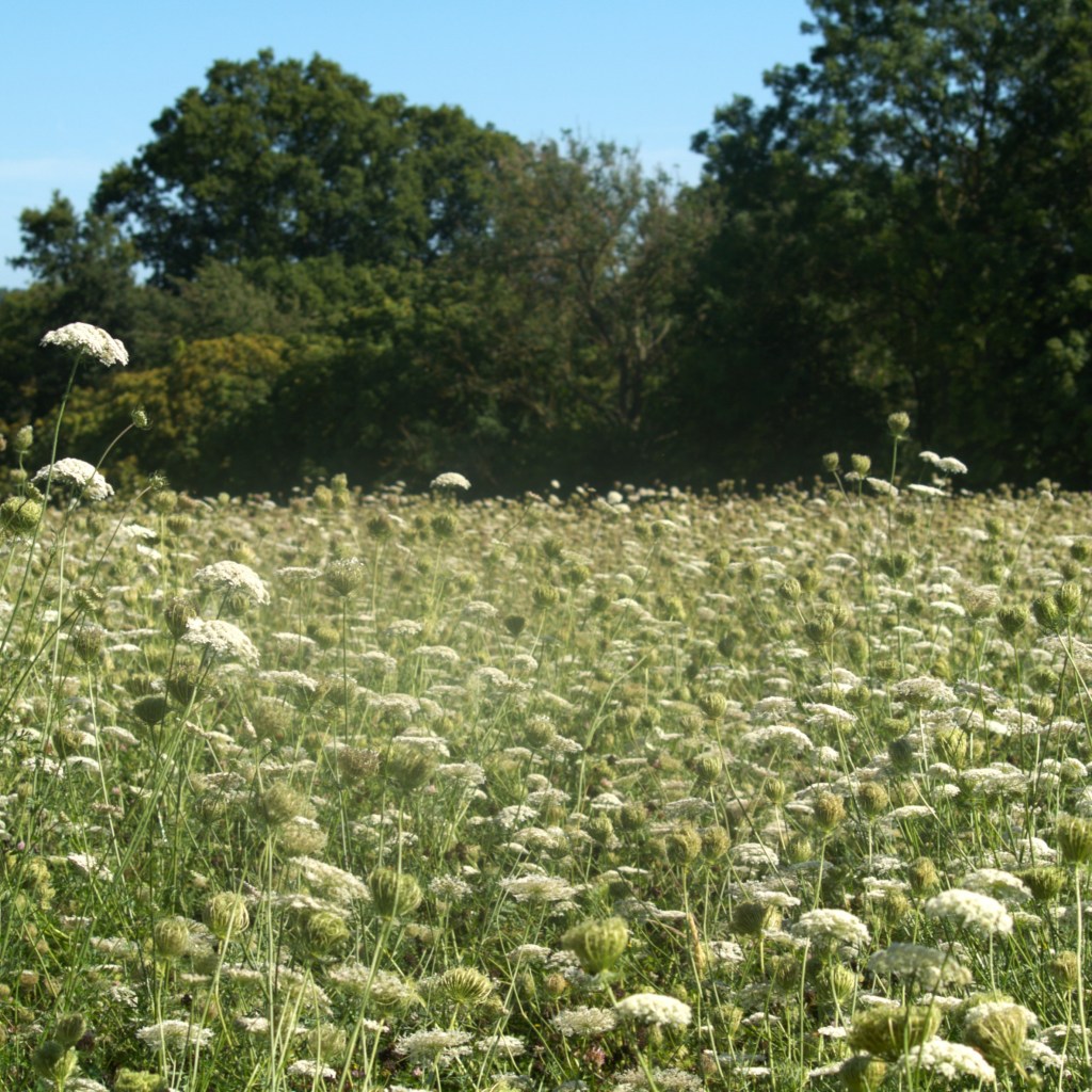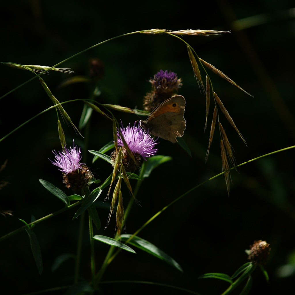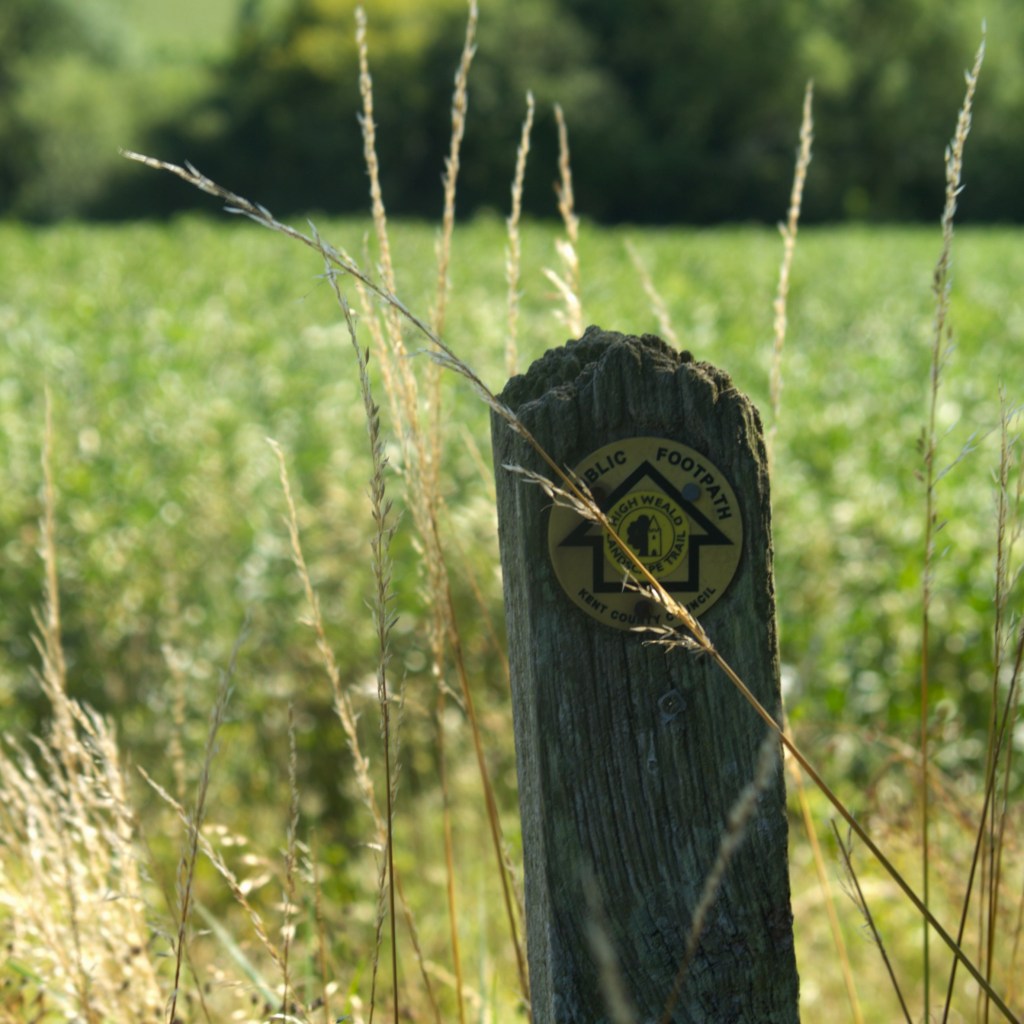We found ourselves all parked up and making our way down Cranbrook High Street before 10am, keen to get an early start on this longer walk and make the most of the (relatively) cooler temperatures of the morning. After nosing in a few closed shop windows and making our way through the well-kept churchyard, we crossed the shady edge of the playing field and walked out into the countryside beyond, just as the bells began to ring out behind us, serenading our departure. Walking along the edge of a field of white flowers, we quickly came across our first major obstacle of the day, when we found that a tree had fallen over the path and its leafy canopy was obscuring the way. At this point, we each made a different conceptual decision. Beth chose to find a way around, managing to easily locate the path that had been created by the others who had come to this same decision. Meanwhile, I chose to maneuver myself under, over and through the branches to the other side, where I rewarded myself by picking a couple of juicy blackberries whilst I waited for Beth to rejoin me. A couple of minutes later we reached our first, welcome stretch of woodland, with such patches becoming a haven for shade throughout the day. After this came a brief, steep incline which helped wake up the legs a bit before turning down a quiet road to pick up a footpath on the left a hundred yards later. As we made our way between the thick growth of late summer, butterflies sprang up all around us, and I turned around just in time to see half a dozen fluttering about Beth, one of which decided to land on her too.