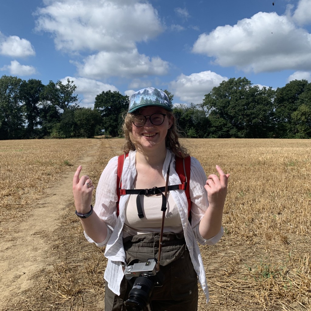 Crossing over a small bridge across a stream beneath a few trees, we emerged again into the sunshine on the other side to find ourselves walking through the first of the many fields that would make up a large portion of the day. We were indeed already hot, as predicted, although a breeze mercifully accompanied us for the first half of the walk, which really helped to keep the suffering away. As we made our way down the side of a tall, golden-brown crop, the presence of several dragonflies indicated the presence of water, which we crossed a minute later and enjoyed a few minutes of shady trees beyond. It was at this point that I turned around to find Beth walking along with her hands held up in front of her, in a sort of reverse t-rex position. When Beth gets particularly hot, her fingers begin to swell and get uncomfortable. Evidently, this was a technique she had picked up on Instagram to help reduce the swelling and was trialling, and I am pleased to say that it did indeed bring her some relief! An opening in the woods appeared ahead, and the world outside wobbled with heat, although a pleasant gust of wind encouraged us to stop for a second before carrying on our way.