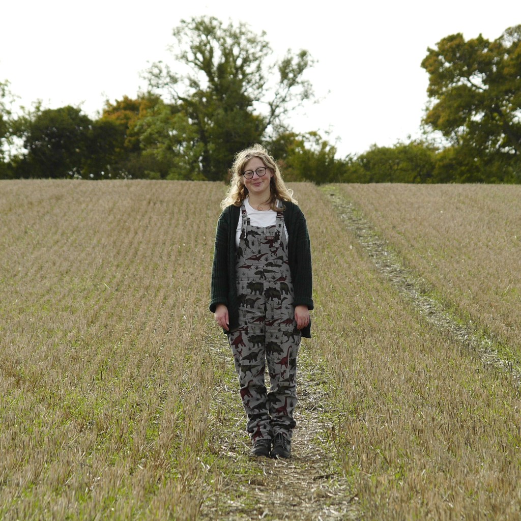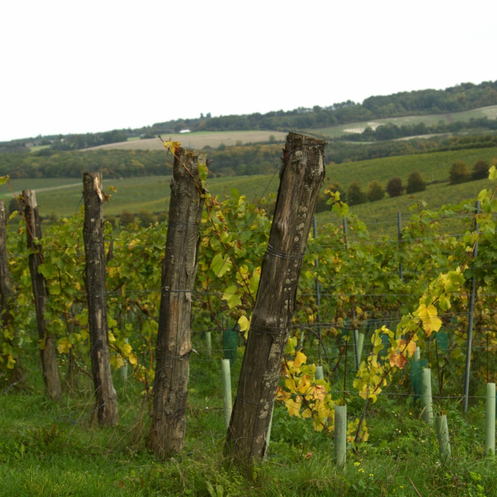 The route began along the edge of the country park through colourful leaves, before we exited and turned right down a wide track around the edge of a wide field, enjoying the morning coolness. After passing a couple of houses the path began to turn a little more seasonal, although there was plenty of fungi on passing log piles for Beth to admire. We headed down the edge of a field sloping slightly uphill and entered a patch of woodland, afterward emerging back out into the open onto the Silverhand estate. This is where we got our first view into the surprising and hidden valleys hiding at the top of the North Downs that would make up most of our day. A vineyard swept away downhill and rolled across the countryside, with a patchwork of open fields and woodland visible on the rise ahead. We could see quite far from here and spotted promising fields of cows and sheep in front of us. We made our way down, continuing through the middle of the vineyard where a kestrel swooped about overhead. We then began to slowly climb again, finding ourselves coming out into a large field containing the distant cows which we had spotted earlier, the route then leading us out to the road next to Luddesdown Church.