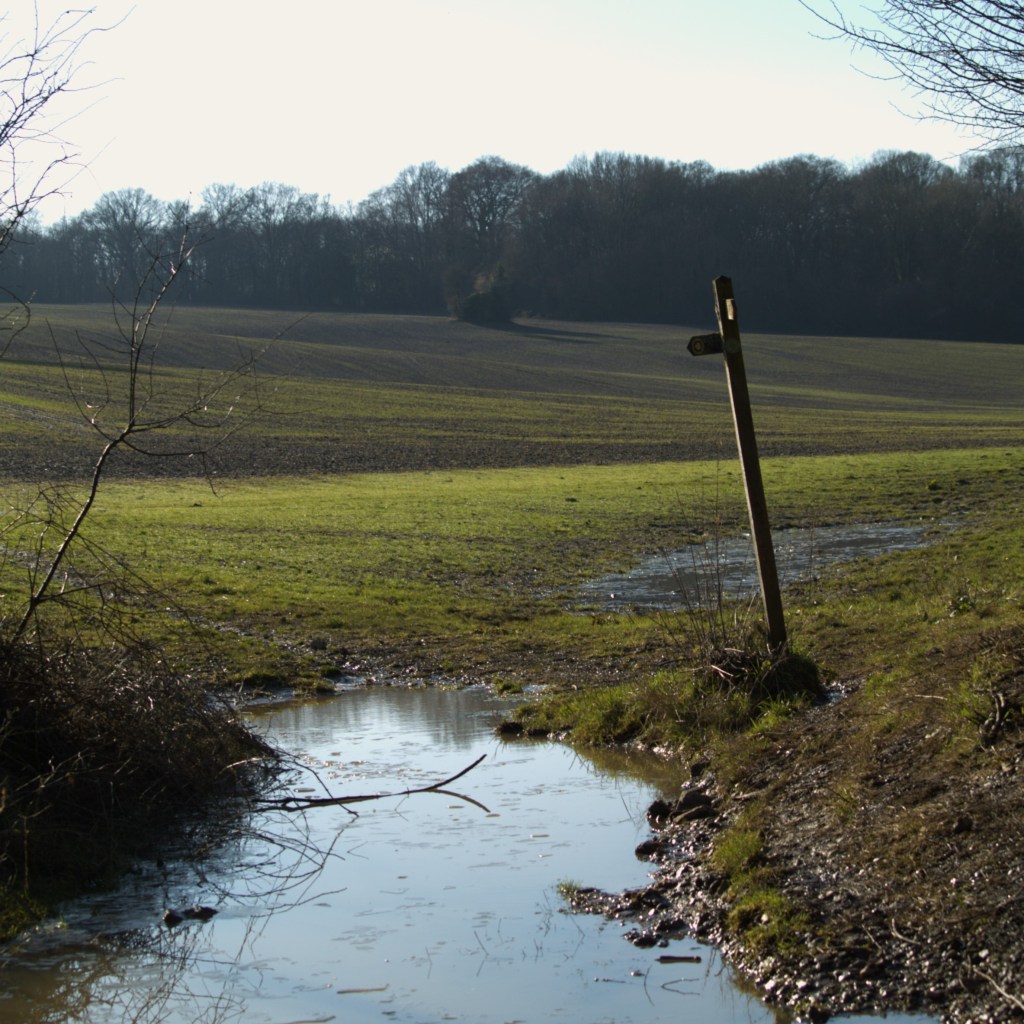 This station itself was part of the Spa Valley Heritage Railway, and as such was very nicely kept and a bit old-worldly, as we walked along the platform and up the stairs before Beth almost walked into the swinging automatic doors. We then turned right down Forge Road past a few nice houses, a handful of geese, and patches of woodland, where a few hopeful shoots of green had begun to rise. After a few hundred yards we took a surfaced bridleway on the left through the trees, where several more bird calls prompted me to check my app as we went. This went on until I dropped my phone on the hard surface beneath my feet, at which point I decided only to have a look when not moving. We passed some large shaggy rocks which turned out to be sheep, just after which the drive gave way and we picked up our first muddy path of the day. It ran alongside a small stream, which we crossed using a wooden bridge into the field beyond. A soggy stretch of green grass sloped upward beneath the warming sun, and it wasn’t long before I began to de-layer. At the top of the climb was Bullfinches Farm, and we carried on along a slippery footpath through another three fields, before sloping downward through a fourth and passing beneath some trees.