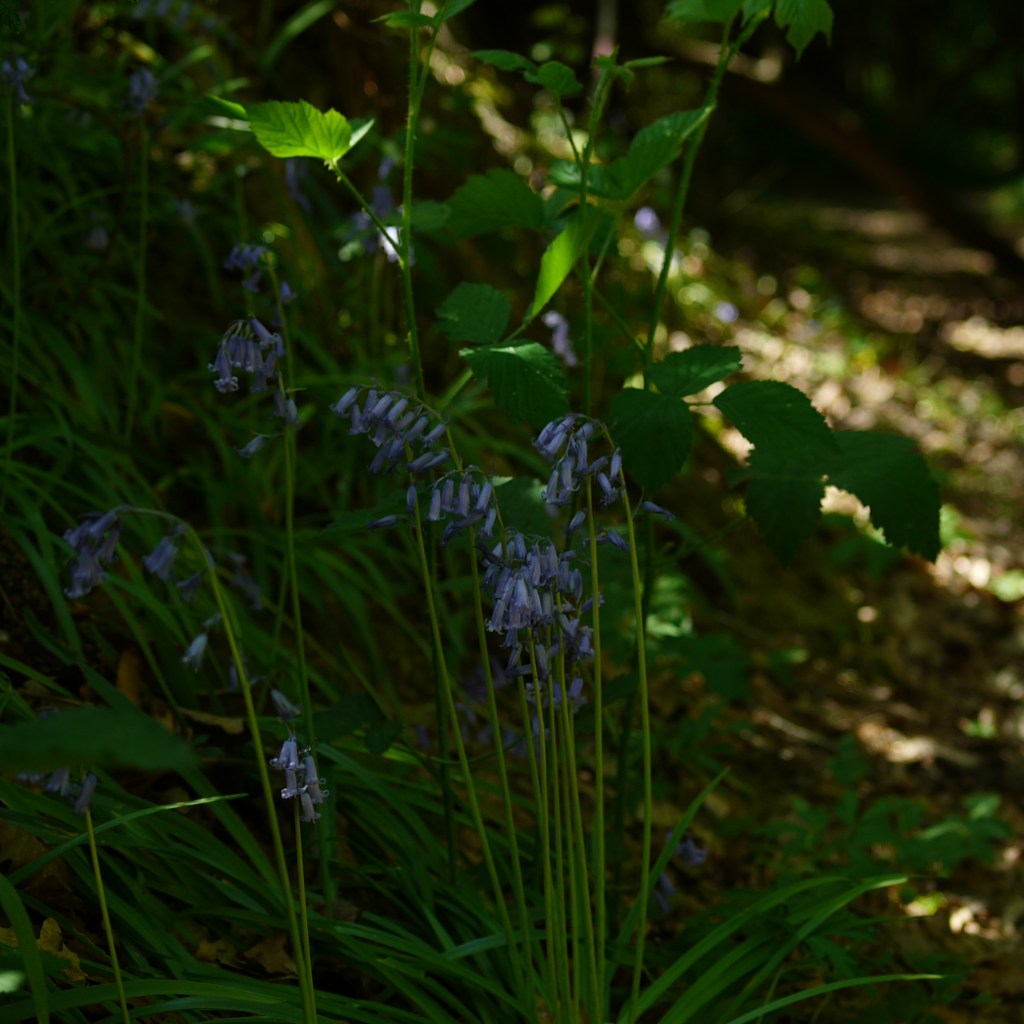 Where we had turned left a couple of months ago, we now turned right to enter the day’s first woodland section. The shade beneath the green leaves was welcome, as the morning was blue-skied and hot. As well as continual spatterings of bluebells, we also found a stretch of wild garlic lining the undulating footpath. As the path levelled out and steadily led us from the trees, the garlic changed to thickets of cow-parsley, as well as thousands and thousands of tiny fluffy seeds blowing through the air, which gathered at the edge of the track like great clumps of spider webs. They also got caught up in my beard, which was mildly itchy.