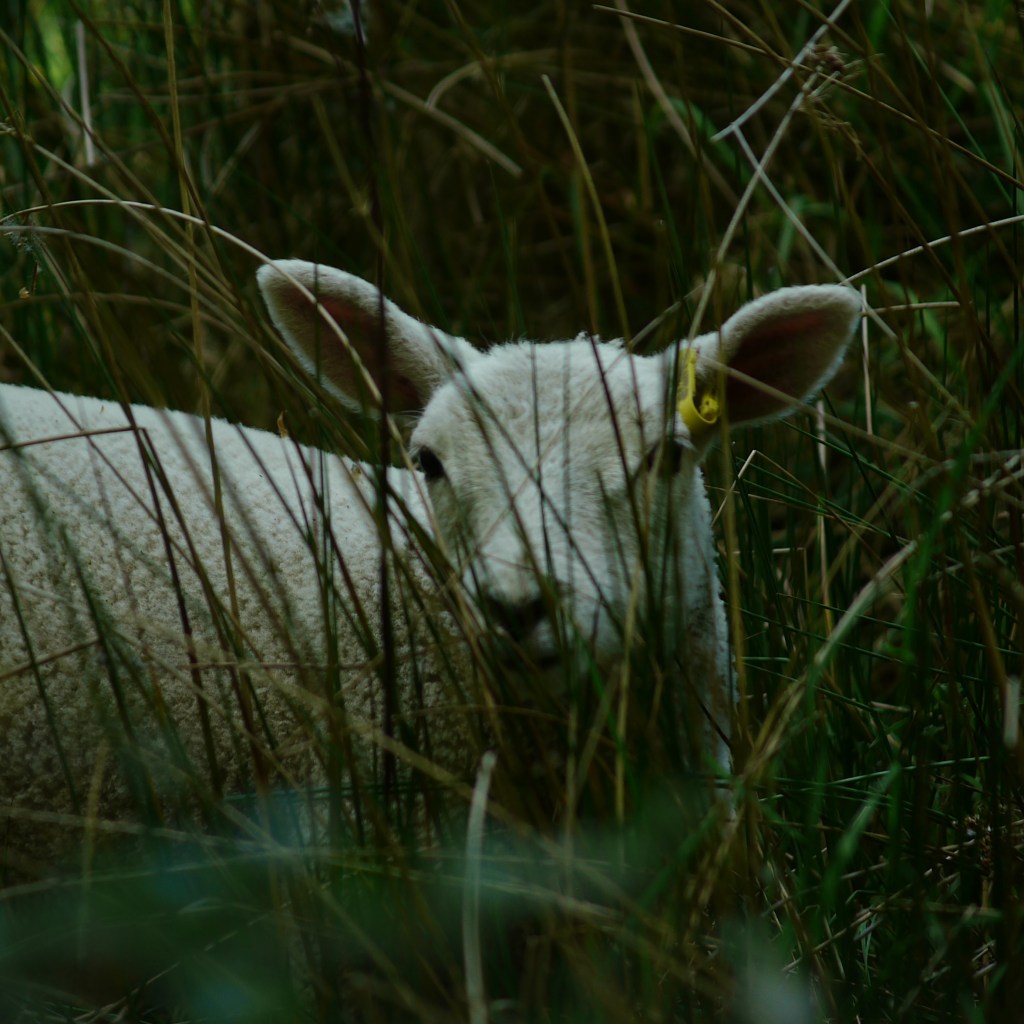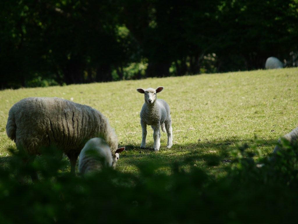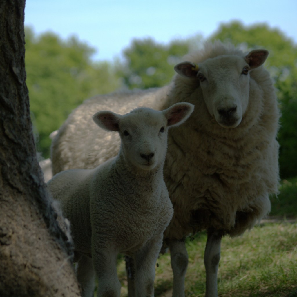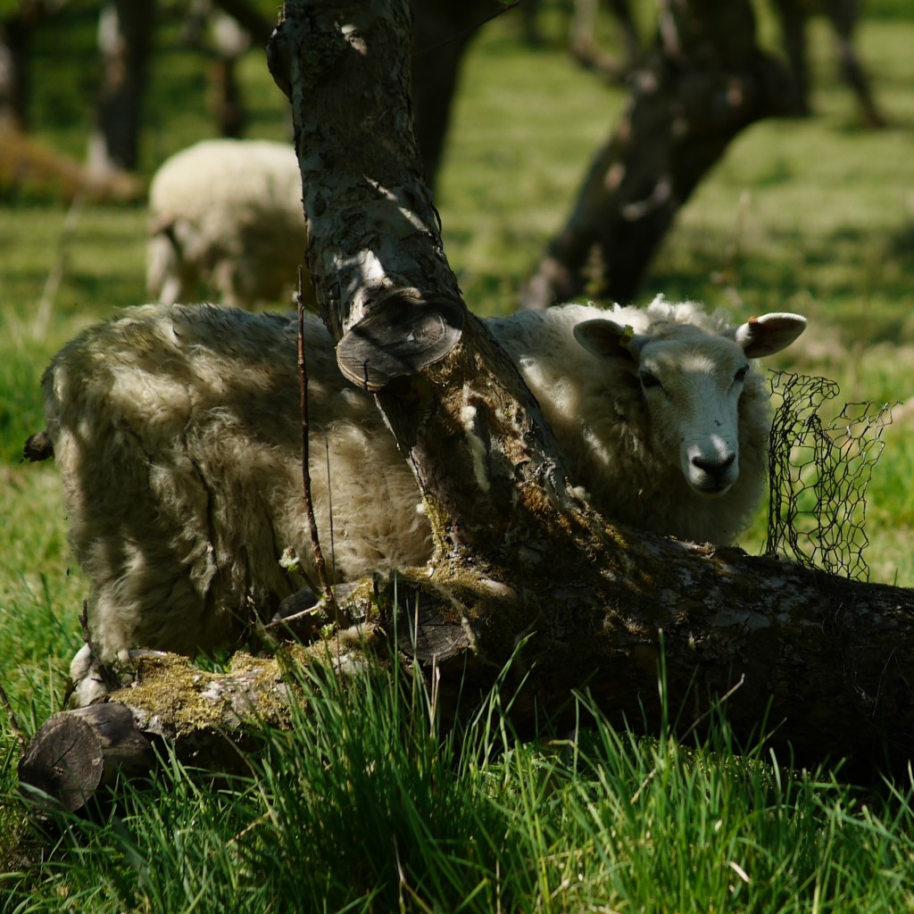 The next stretch was a series of orchards, although we found that the third one had now been converted to a crop field. We managed to collect a lot of wool for our upcoming wedding before coming across the culprits lazing amongst the shade of the trees. Our presence did disturb them somewhat, but they did not go far and we stood and watched them bimble about enjoying their lazy afternoon together. Across a quiet road, we descended steeply before climbing back up through a small wood containing the day’s best patch of bluebells. On the other side, we came across a large sheep field. Many ewes and lambs monitored our passage as we made our way up the edge, and plonked ourselves down with our backs to a tree at a crossroads of paths to enjoy our lunch in such an idyllic setting. We watched the flock wander about the fields as we ate, with two mums and four lambs even accidentally stumbling upon us a little closer than they might, having not spotted us until they poked their heads around one of the nearby trees. One of the ewes stood and baa-ed at us for a while, before deciding we were safe and turning away. As we got up to continue, one of her lambs also bleated, and together Beth and I replied instinctively with perfect bleats back. This obviously greatly confused the poor lamb, as he continued to stare at us intently for quite some time as we carried on up the field until eventually we were out of sight.