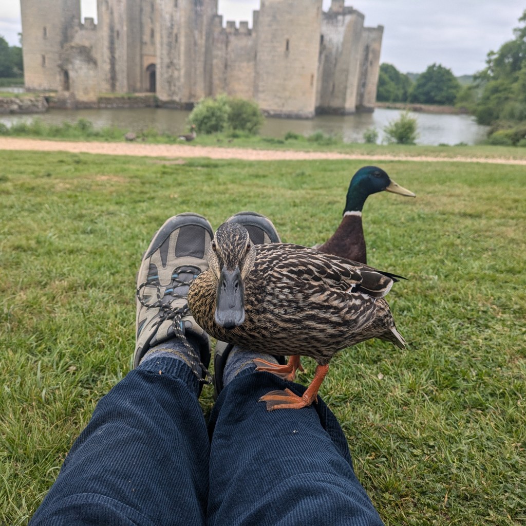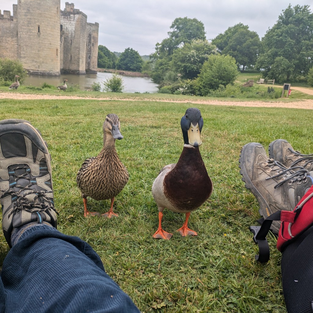 Next on our to-do-list was lunch, and of course this meant visiting the castle itself. We made our way around the edge of the mote, admiring a pair of geese with their three goslings, before settling ourselves down in our usual spot. One thing we particularly like here are the ducks, and we had barely sat down when a pair came waddling over to investigate. Of course, I was only too willing to share bits of my sandwich, and these confident little quackers were not shy in coming forward. The lady duck was much greedier than the male and ate much more of the food we threw. We were very much enjoying the company, even when the lady duck pecked Beths coat button in confusion, yet things were soon to take a dramatic turn. Another duck came over to see what was going on, and our original male duck instinctively went into attack mode. He lowered his neck and charged beak-first at the intruder, chasing him away. He then returned for more food, but it wasn’t long before he felt the other ducks were getting too close again, and so began charging about protecting the stash. This eventually devolved into a full-on fight between two of the mallards, each nipping at the other’s feathers and holding on to each other in some kind of duck-wrestling match. The situation was only resolved when a large Egyptian goose came over to break things up (I wouldn’t argue with him either). Eventually, our big, brave duck returned triumphantly. Unfortunately, his Mrs had already eaten everything by then and so I couldn’t give him any kind of well-earned reward. Naturally, this was a very entertaining lunch, and we were in high spirits as we waved goodbye to our new friends and headed off for the second half of the walk.