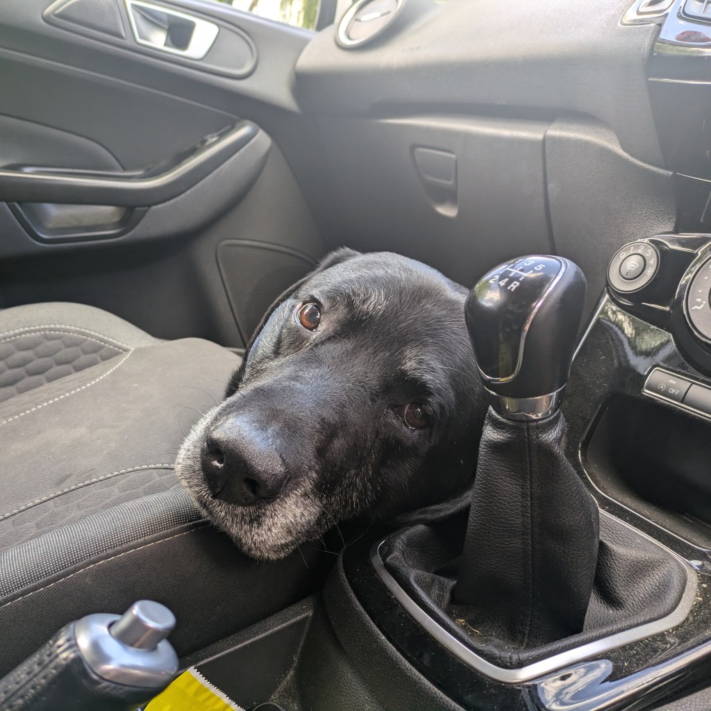 I left Chidi with Beth and ran back up the road to where a cluster of houses had been, and tried asking around. Alas the farmyard with a ‘Loose Dogs’ sign was not missing one, but they did suggest a house up the road who owned a black lab. Unfortunately, this too was a false lead, as the lab in question was currently away on business in Newcastle. Fortunately however, this is where Chidi’s luck began to turn. The guy I spoke to was named George, and was very friendly and helpful, saying that he would take him in and ask around. As such, I made my way back down the road to find Beth still waiting with Chidi, who slowly padded over with a wagging tail to greet me. After another lap of the neighbouring woodyard, we managed to get him loaded into the footwell of the front seat, where he settled down quite happily, and actually looked rather comfortable for the short drive. At the other end, we opened the door for him and he slowly clambered out, and he made his way diligently into George’s front garden, where he continued to wander about, pleasantly puzzled. We thanked George, who promised to keep us up-to-date with Chidi’s progress.
