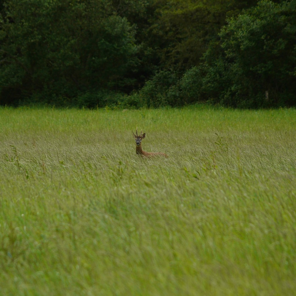 We carried on our way, and without realising it entering someone’s back garden after crossing the incorrect stile. Quickly realising our mistake, we sheepishly doubled back and proceeded to the correct stile. We continued through a series of colourful meadows and patches of woodland, eventually bringing us out into a meadow where the flowers grew high and wild to our right. As we crossed, half a dozen deer heads appeared above the grass just off the path, our unexpected appearance causing them to leap away. They eventually came to a halt at the edge of the trees across the field, where they waited for their friend, who was stuck on the other side of the path, unsure of what to do. He ran about for a while, and we turned and made our way to the opposite edge of the meadow, where we settled down in the grass for lunch. I am sure they were reunited soon enough, and the sun came out just in time to make this a very pleasant stopping point.