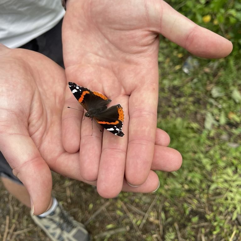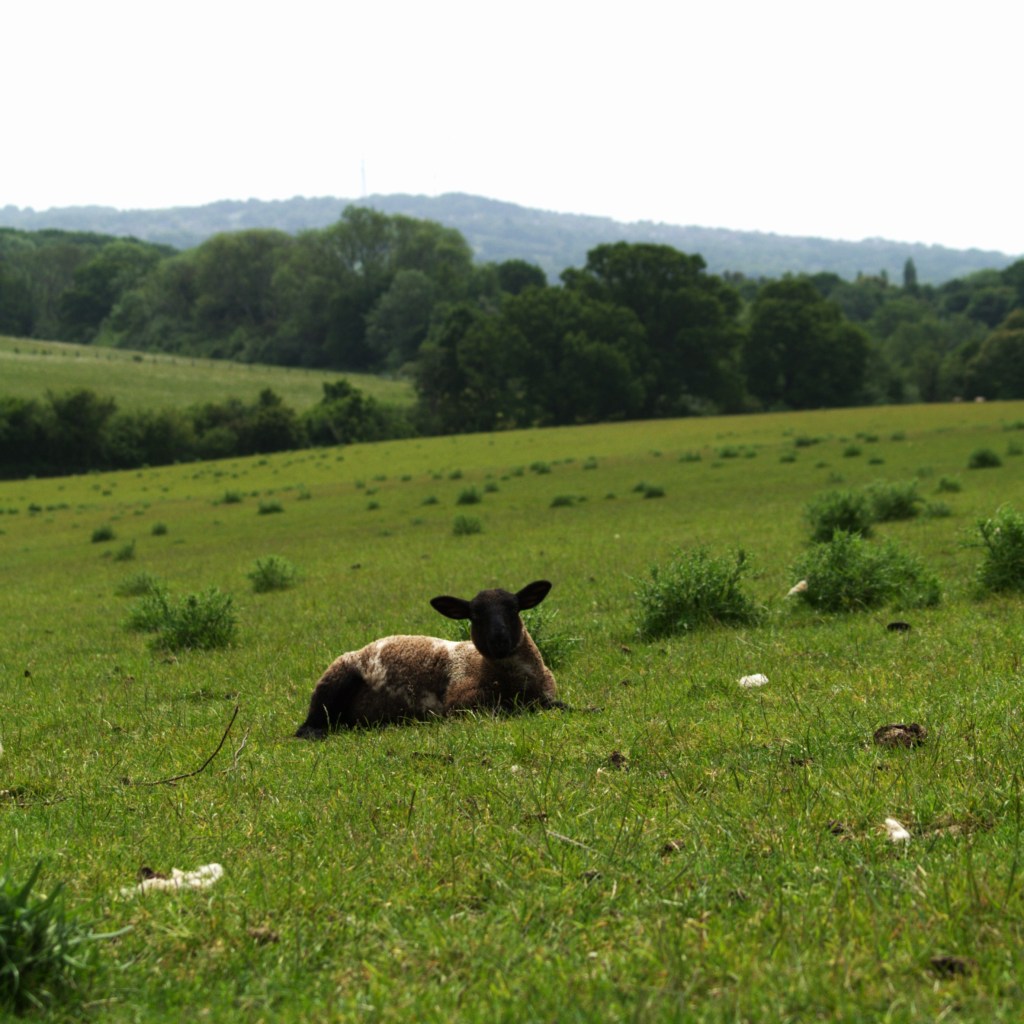We carried on along the top of the ridge amongst a further flock of sheep and overgrown lambs, finally leaving them behind on the other side of the large field. We then went through a large vegetable patch belonging to one of the nearby houses, and then picked up a stony track, which lead us out onto another quiet country lane. I don’t think we came across any cars here, which was fortunate because we decided to practice our upcoming first kiss in the middle of the road. The lane did eventually lead on to a busier road, although we only had to walk a short distance along it to find the next track waiting for us on the other side, during which time we rescued a butterfly from the verge, settling it back down out of harm’s way. The track opposite was a stone driveway, which lead us past another flock of sheep, this time containing much fresher looking lambs, and we were able to harvest plenty of wool to use as table decorations. To our delight, we found our footpath on the left then took us through the field, before dipping down through a patch of trees. We climbed back up the other side, where we found a small, ploughed and very dry field. The path continued past a couple of houses before bringing us back to a small road.