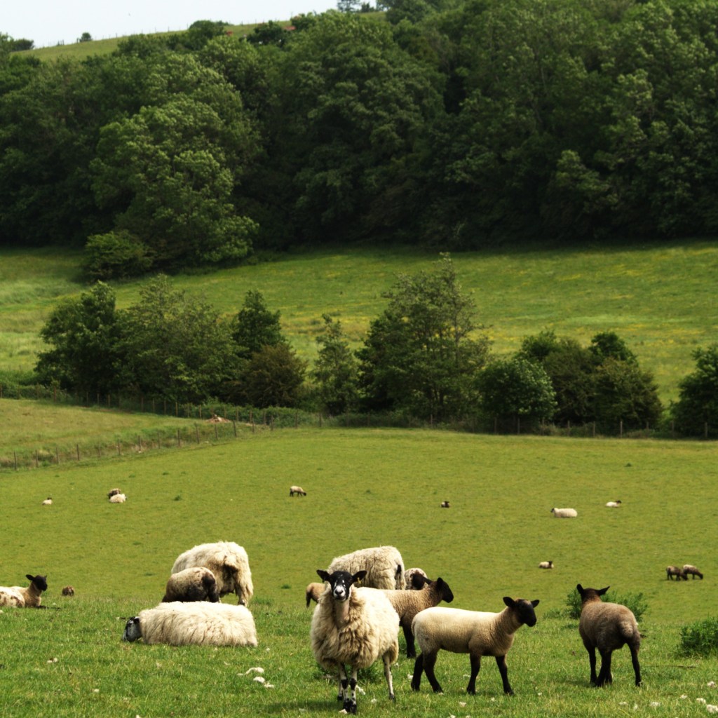 Instead, we were eased into the summer season with some gently declining road walking, before picking up the day’s first footpath on the right not long after. The day was warm, but a stiff breeze blew in from the nearby coast, so close that you could smell the sea on the air. We descended back down the steep hill and crossed the train tracks, which brought us out into open countryside. We made our way over a stream across a small wooden bridge covered with wild roses, on the other side of which we found our first sheep field of the day. Climbing back up the opposing steep hill was made much easier by their company, the flock still including this years lambs, although I have to say they are starting to look rather large, and one or two of the ewes didn’t look impressed when they tried suckling. At the top there was an interesting sculpture, inspired by the Bayeux Tapestry, with hawthorn growing through the middle. Apparently this leads to a covering of blossom in spring, which the lambs love to investigate – we will have to come back and see this. There was also an information board to hand, which of course Beth loved, and we discovered that farm animals from the middle-ages were much smaller than they are today – fully grown cows were only a meter tall!