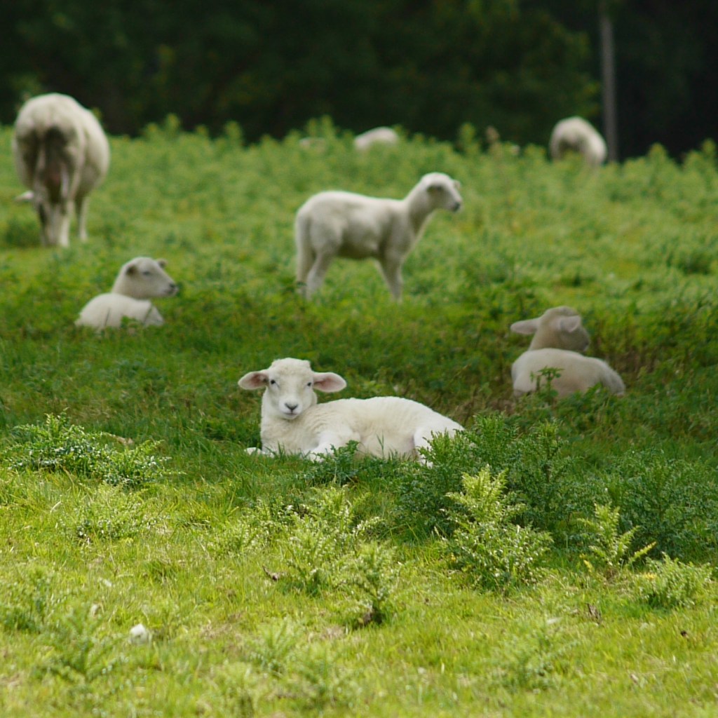 By this point, Beth had already been using phrases such as ‘lets just see where it goes’ and had not been checking the map until reaching a decision point – a very impressive and relaxed attitude. However, it soon transpired that we had forgotten the maps existence altogether, as when we saw a stile across the road, we climbed over without thinking. The stile was quite overgrown, and we were rather surprised to find a field of Christmas trees growing on the other side. We made it a short way into this field, before remembering the map, and thinking that we had better check. Sure enough, we had gone the wrong way. We waved goodbye to the trees, climbed back over and began to walk in the correct direction, down the road. This road section continued for a short while, but thankfully we only met a couple of cars, as we crossed from left to right and back again to accommodate all the bends and corners. As the road levelled out at the bottom, our next footpath awaited us just before a bridge. We hopped another stile into the field, where we followed the path along the bank of a small stream. Lunch time was imminent, and so we began looking for a likely looking spot, eventually reaching point where the stream met the river Brede. Through the trees and over the bridge ahead, I caught sight of a swishing tail. Such a swish could only belong to one animal, and I moved a little closer to confirm my suspicions. I indeed spotted what I expected to see, and quickly turned around, deciding that there was no need to turn Beth’s lunch into an anxiety fest. I was most relieved when she chose a spot with her back to the upcoming obstacle, sitting on top of a sunny bank looking across a bright meadow, with a flock of sheep across the way, a few lambs scampering about. It was indeed another perfect lunch spot. Yet lunch can only last so long, and so before returning to our feet, I confessed to Beth what awaited us across the bridge. And so, we bravely ventured forth.