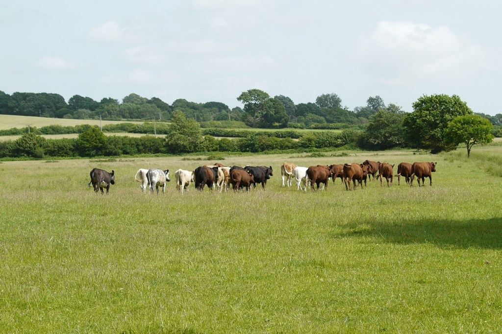 We descended from the bridge cautiously, and came face to face with what we know to be the most dangerous obstacle we can come across in our little corner of the world – cows. And not just cows; a large, clumped together herd of beefy looking cattle, the majority of which were already staring at us. Previous experience was setting alarm bells ringing, as their body language suggested unease, and they were close to both us and the path we needed to take, which went diagonally right across the middle of their field. We carefully ventured forward, and paused about half way between the bridge and the herd. They didn’t move, and the bustling amongst themselves began to increase. I decided that the best thing to do would be to send Beth back to the safety of the bridge, and see if I could use my animal know-how to get them to move. I slowly moved closer, clapping and shouting as I would to get my goats to move. Cows are evidentially less pliable than goats, however eventually they began to slope away together, trotting off out and away across the field. They continued to move further from the path, and so I beckoned Beth forward again and we began to make our way carefully toward the opposite corner. Beth was understandably nervous, and I wasn’t exactly comfortable as I continued to monitor the herd. We didn’t make it very far, probably not even a quarter of the way across, when the herd’s behaviour again began to change. Their direction had started to curve back around, which would likely bring them back toward the path sooner rather than later. They were also looking agitated again, almost winding each other up, a few members at the front even beginning to break into bursts of running. We immediately changed plan. We turned and made our way toward the nearest edge of the field, deciding to walk around the outside to give as much space as possible to the herd, with the added insurance of we could always hop the fence if we had to. The hustle and bustle continued behind us as we reached the fence, but thankfully as we made our way up the field, they again settled down to a calmer state, the intruders evidentially now at an appropriate distance. Even so, we still decided to hop the gate which we found in the top corner, despite it being wrapped with barbed-wire, to get us well and truly out of harms way. This brought us out to the access road for the waterworks we had just past, and our heart rates returned to normal as we looked back down the field now to our right at the rumbunctious herd. Soon enough we were back on track when we reached the field’s next corner.