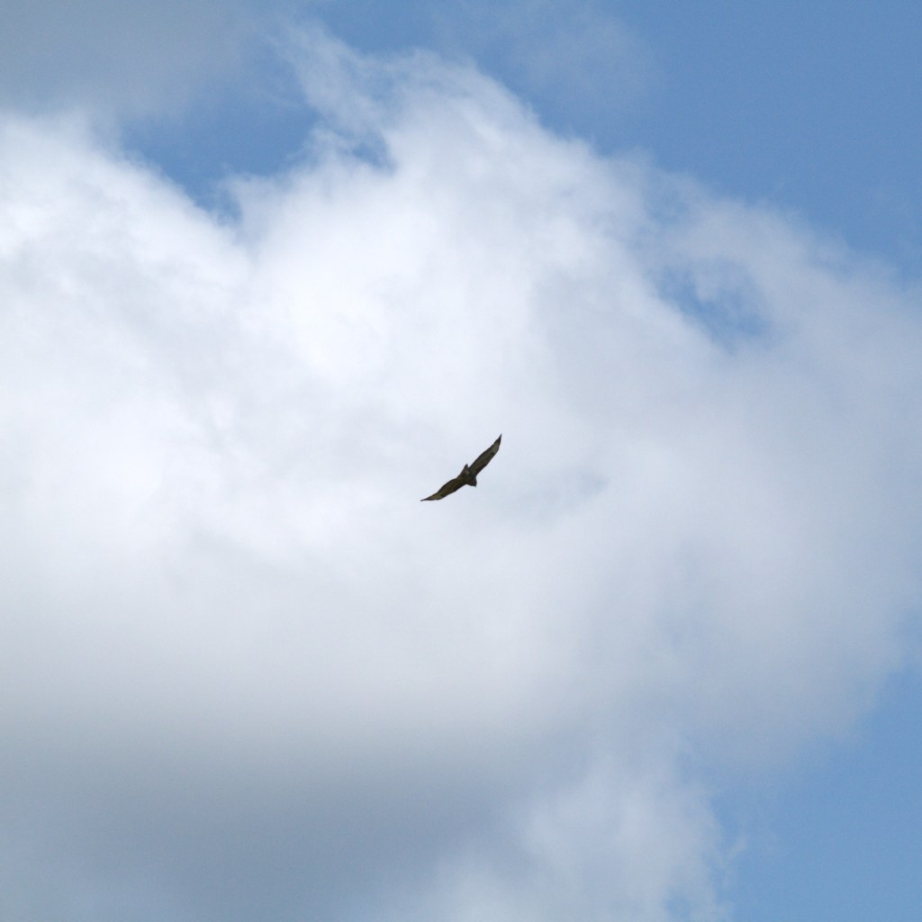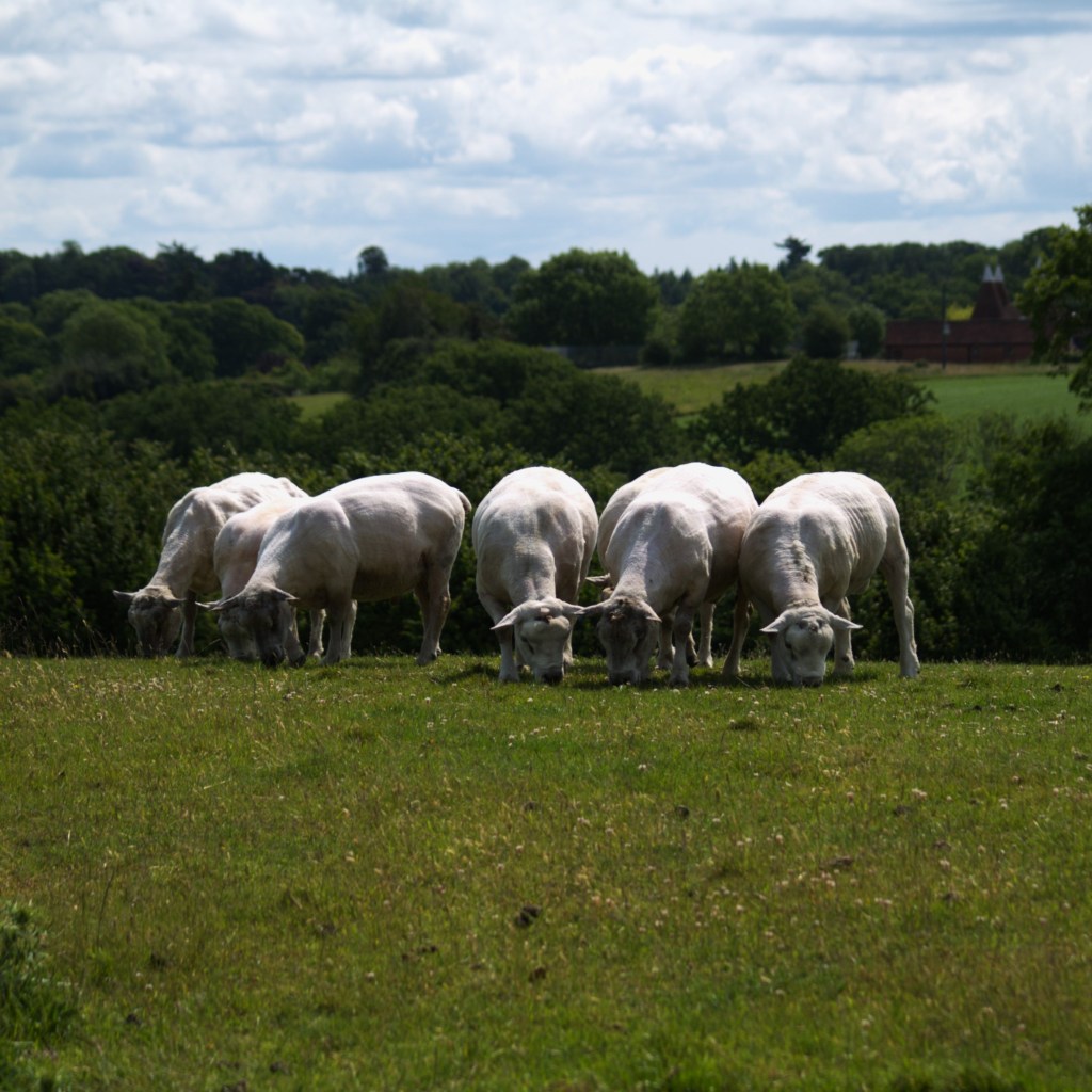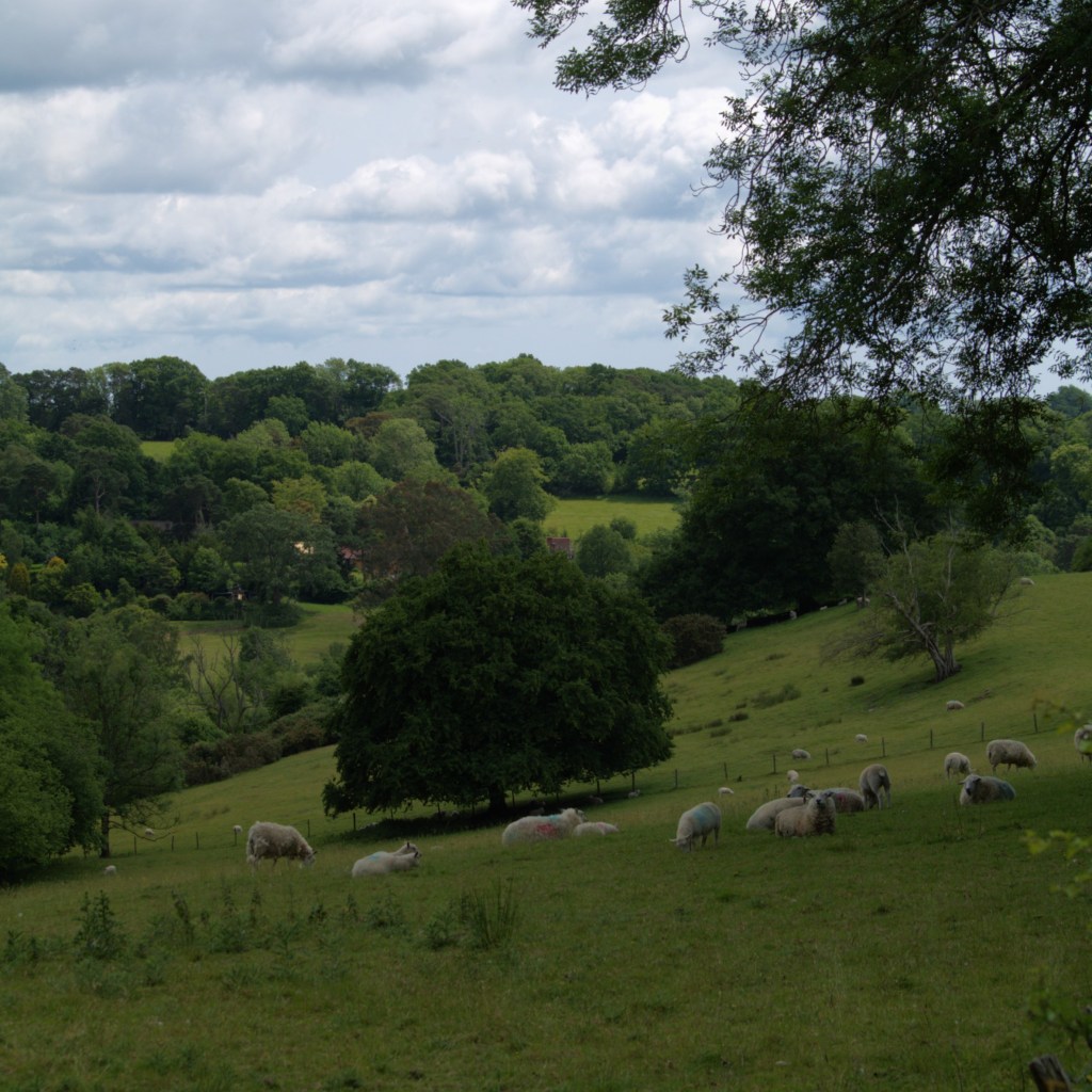 Leaving the farm behind us we carried on up the road, past the well-kept allotments and into the Wadhurst Church. From there we made our way through the town, across the road and quickly out the other side, past a bench directly facing a plain fence, for some reason. Back out into the countryside, we crossed a sunny field with a few sheep sheltering at its edge as a buzzard flew overhead. We carried on past the next flock, and entered “Snapes Wood”, which Beth said reminded her of the New Forest, and where there were a few slightly muddy patches to manoeuvre around following the week’s rain. It wasn’t long before we crossed a rail line and came out of the woods on the other side. Here we spotted either a fox or a hare running away through the long grass, as we walked up the steepest hill of the day so far. Our boots carried on across the stretching farmland, during which time I spotted a snake slithering away at the side of the path, and we walked through the middle of a pleasant-smelling meadow full of dancing butterflies, as the route began to slope back downhill.