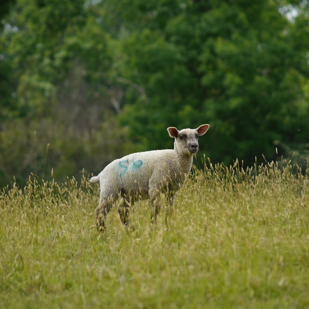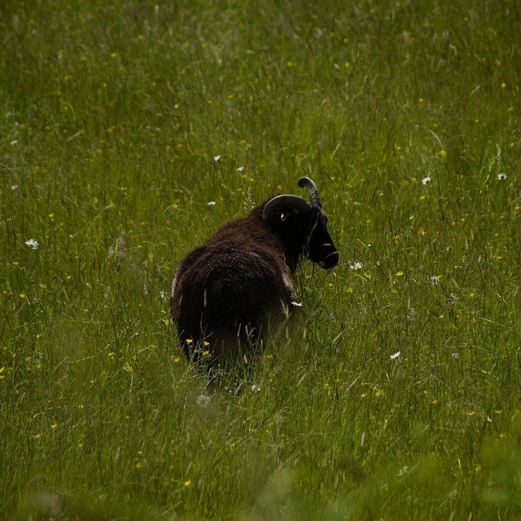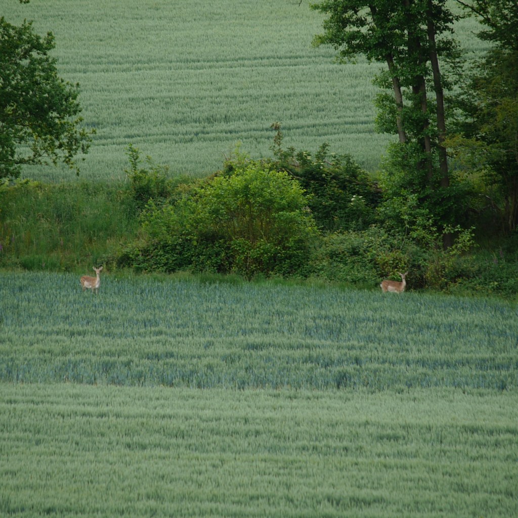 With lunch finally eaten, we set off for what was left of the walk at about half past two. We crossed back over the stile and carried on up the road, picking up a long driveway to the right. We then eventually took a footpath out across the countryside, past a magnificent oak tree and on over long, open fields. We spotted another farmer hard at work and passed another flock of sheep lying down together beneath some trees. Here, Beth suddenly came to an abrupt halt. Following her pointing finger, I spotted across the way a deer staring at us from amongst the crop. A second deer was next to it, and as we slowly walked along the footpath, I spotted the remaining members of the gang, which Beth’s keen eyes had already spotted. As well as the usual brown, there were also very pale and almost black deer, which we eventually watched skipping away up and over the hill. A long gravel driveway quickly took us from the farm to the small village of Woods Green, which we left a couple of minutes later. The path then took us over the last short stretch of countryside, littered with butterflies, and before we knew it, we were spat out onto the road, just along from the awaiting car.