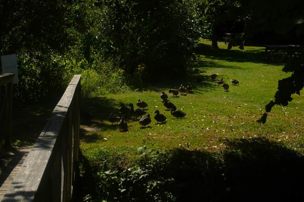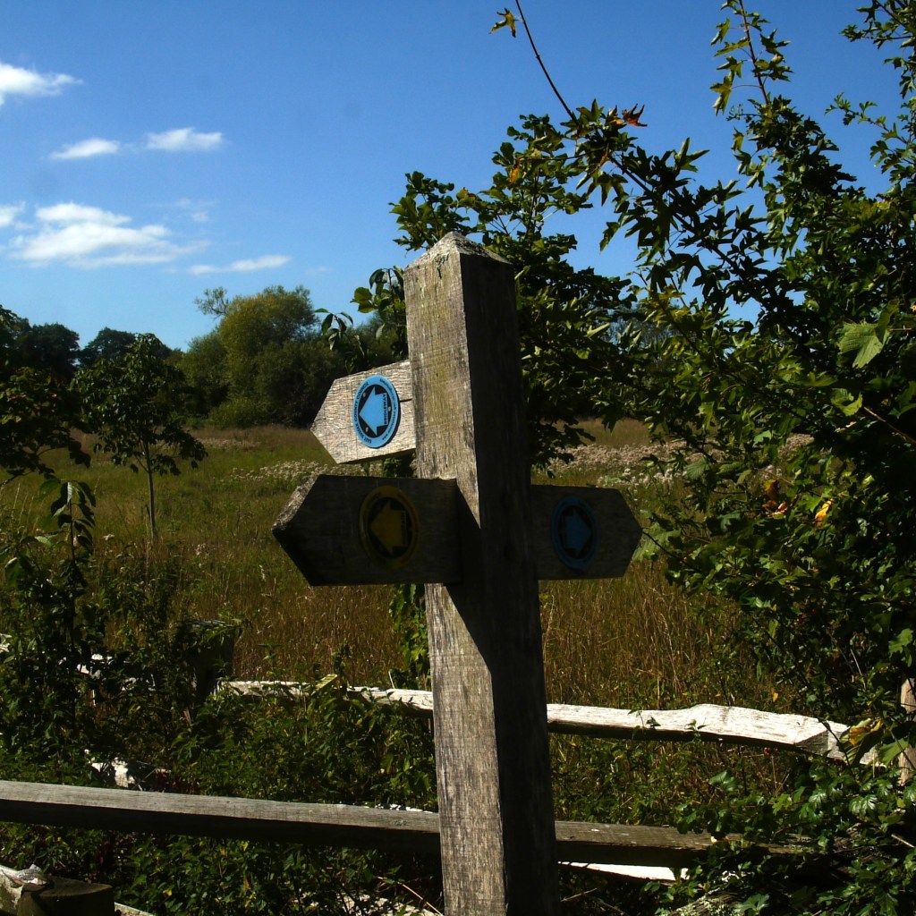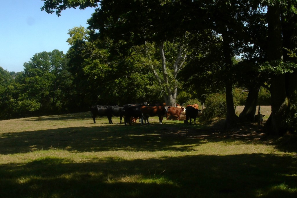 We made our way out behind the pub down a long track, where we promptly almost dropped Beth’s ice-cream when passing it between us – thankfully I caught it and most of it was saved. Eventually the track brought us to an unusual and unexpected complex of quiet apartments and businesses, at which point we turned off the track and around the edge of a small pond. Just as we did so, we found ourselves coming face-to-bill with a small army of ducks heading in our direction. We carried on, and they turned around to show us the direction before one-by-one sliding back down the bank to the pond. Through a small patch of trees beyond, we came out into open farmland, in the second field of which we quickly spotted evidence of cow. Moments later, we saw one standing up at the top of the sloping paddock. We proceeded with appropriate caution, and the cow did not seem bothered by our presence. Only when safely on the other side did I reveal to Beth that one of the routes comments spoke about an un-marked bull field – I suspect that this was it. We crossed the road into another field, and again found it to contain cows. The path seemed to want to take us right through them, and so in an attempt to avoid the herd we made a funny zig-zag across as we attempted to cling to trees, giving them as wider birth as possible. Again, they were unbothered, and we stopped to admire them from the security of the stile.