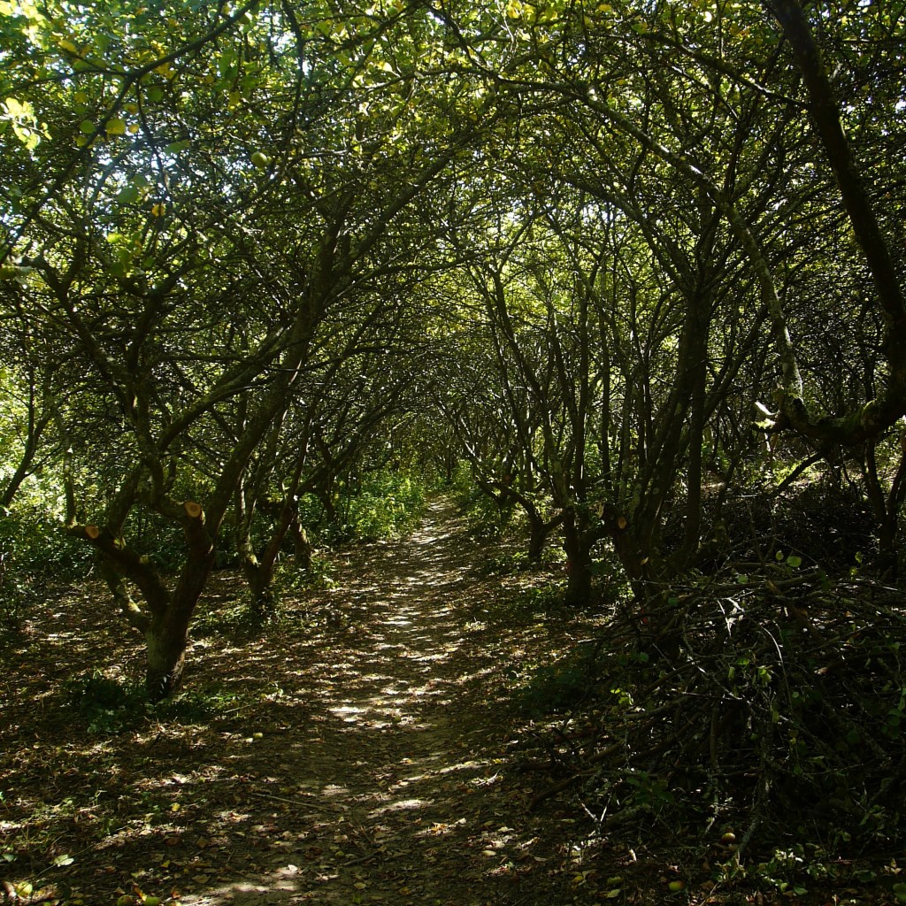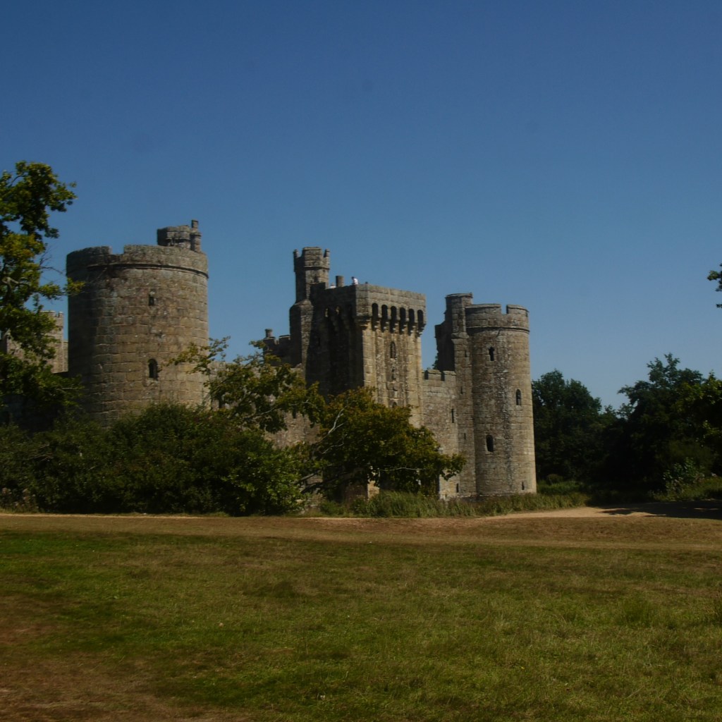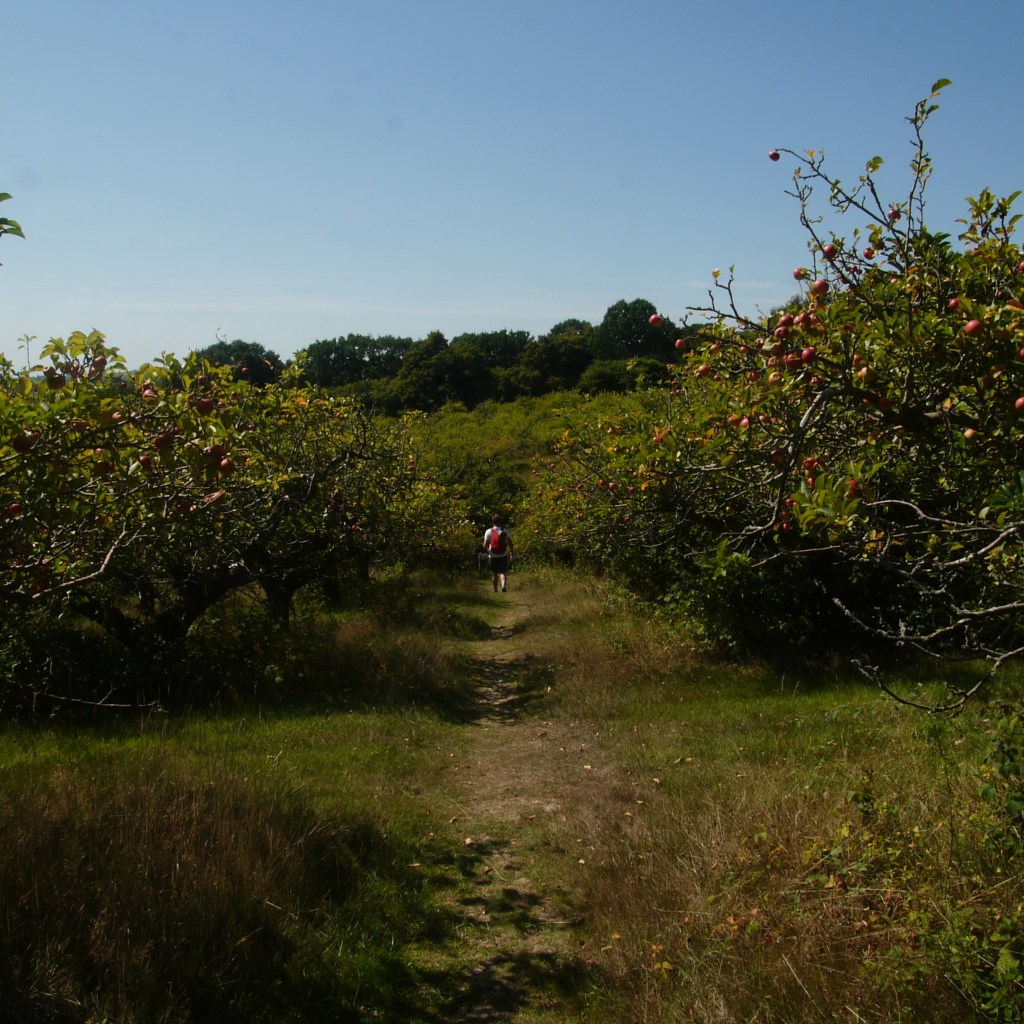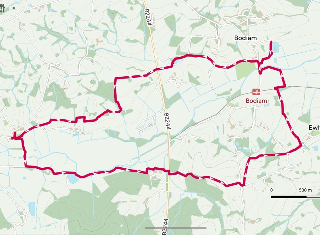 We crossed the Rother and found ourselves walking through sun-soaked farmland, lined with bushes teaming with berries, of which I sampled a blackberry, in honour of bears across the world. After a few fields we came across our first obstacle, which took the form of a small but well-established business park. The route suggested we walked right through the middle, but visible paths and adjusted signposts advised otherwise, and so we made our way around the bordering fence line until we re-met the route. The second obstacle came quickly after, when after crossing a road, the map wanted us to cut through a section of woodland. Whoever plotted the route perhaps did not care much for footpaths and private property, as they would have had us climbing over a padlocked gate to walk through the trees in question. Once again, we instead went around the outside to re-meet the path a little up from the locked gate. Here the route began to slowly climb up through an orchard and a further woodland beyond; fortunately, one we were able to access this time. The shady section was welcome, and we passed a few sheep also enjoying the tree’s shelter to our right. We also unknowingly did a small section of the Bodiam Circular, only in reverse, which we realised a little later on.