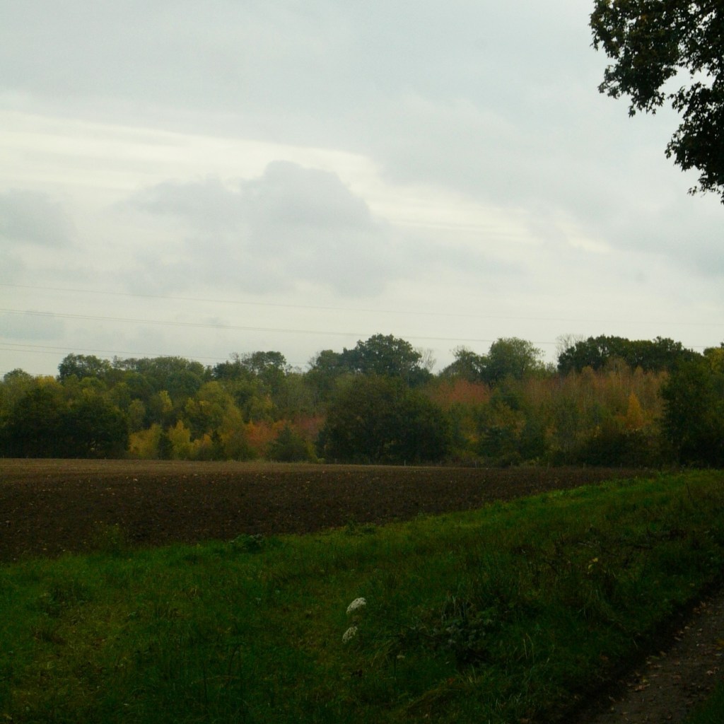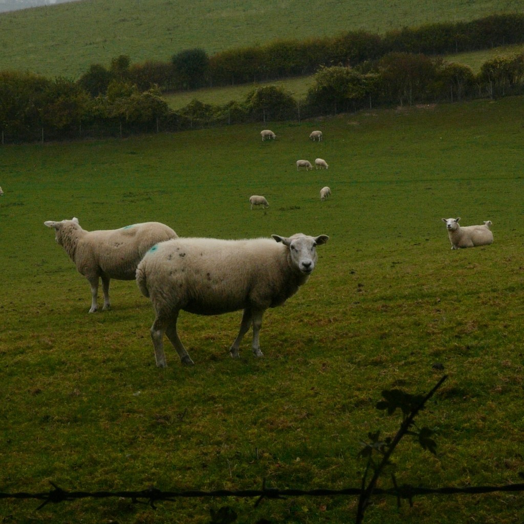 Our timing turned out to be quite good. Shortly after getting back, we entered a descending, tree-covered track, which looked out across a large, far-stretching sheep field. Just as we entered the cover of the remaining leaves, the heavy rain arrived, and we were able to enjoy the sound and watch it wash across the Downs in relative comfort. The worst had passed by the time we reached the bottom and came back out into the open. At this point on last year’s walk, we had encountered a sheep on the wrong side of the fence, which had caused the entire flock to come running from all corners of their paddock to see what was going on. On this occasion, the gate was open and the sheep were already grazing both fields. However, the nearest sheep looked rather surprised at our appearance. They stared. Then, one decided it would be best to bolt through the gate. This then caused their neighbour to bolt. This then had a knock-on effect, as word spread through the flock that, once again, something was happening, and that they should all leg it to the gate. The sheep came in great waves, sometimes pausing to stare in large clumps of wool, before once again charging through to join the others. I don’t know what it is with the particular flock. Perhaps they don’t see people often. Whatever it is, they are notably more reactive and ready to activate their flocking instinct than most of the sheep we encounter.