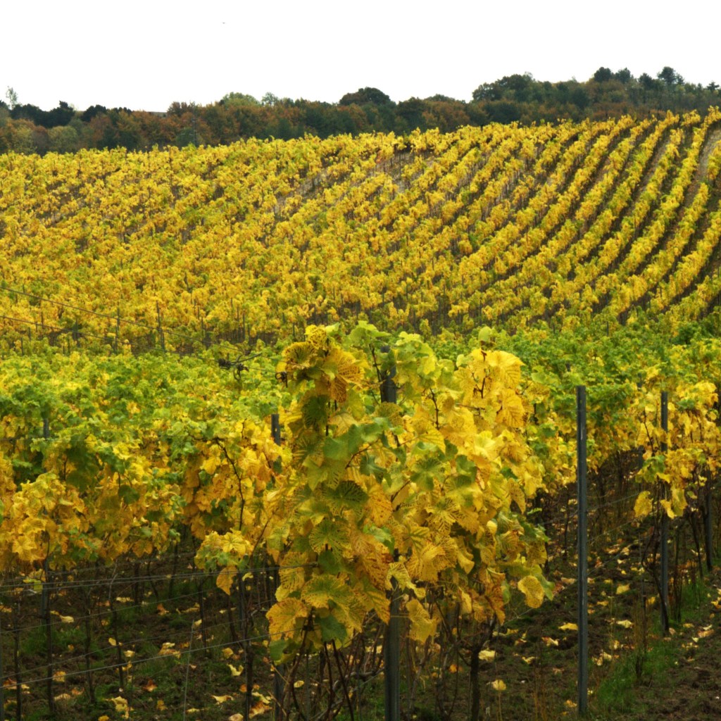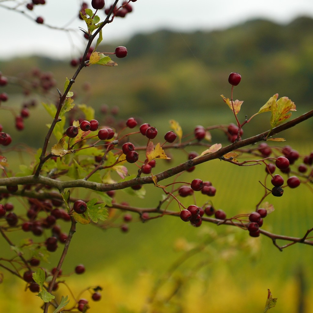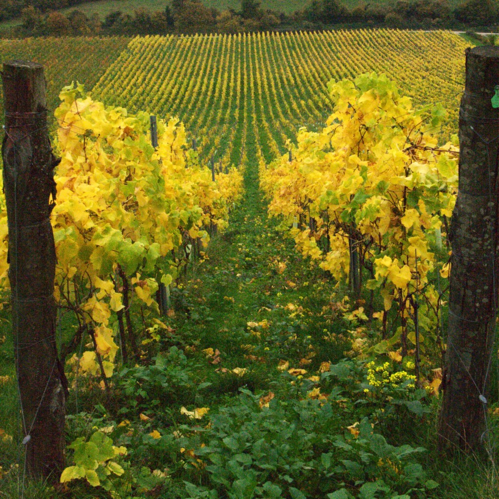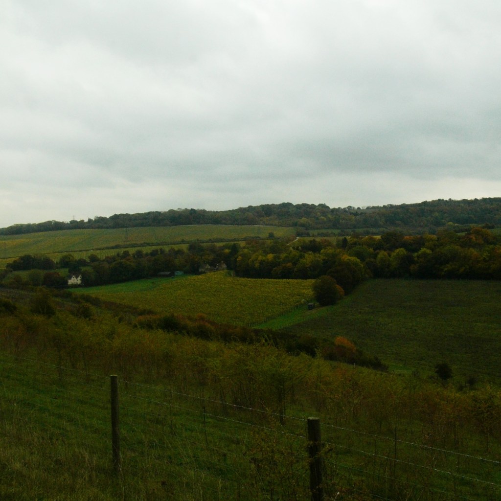 Turds aside, we made our way through the park, where the autumn colours were vivid, and the few spots of rain that had hit the windscreen on the way over seemed to have blown away. We exited the back of the park and turned down a farm track around the edge of a large, ploughed field. A couple more field-edge paths led us up through some further farmland and through a small patch of trees. On the other side our eyes were greeted with thousands of yellow leaves rolling away in front of us, which made up the vineyard through which we would be walking for a large portion of the walk. We began walking downhill through the vines as a crow called out above, before quickly climbing back upward. This undulating theme would make up the majority of the day’s route, as we continued through a patch of countryside which, on our first visit, we had both found surprising. Sat atop of the North Downs, this hidden patch of countryside is a real, undisturbed gem. It is also a middle ground between where the two of us had grown up, which gives it a particularly pleasant aspect for us. We walked along, stopping so that Beth could read all the new noticeboards which had been put up since last time.