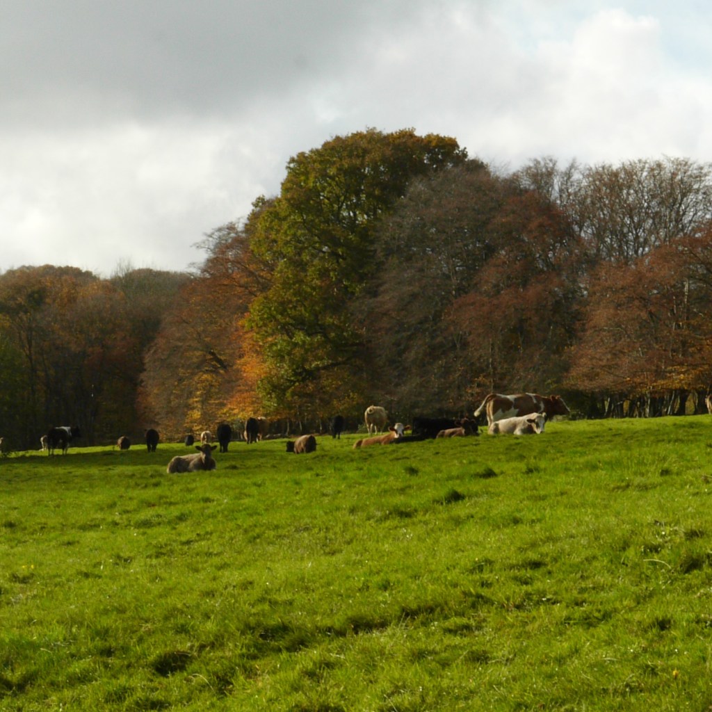 We emerged up out of the woods and continued to climb through more open farmland. Here we came across a large flock of sheep in a bowl-shaped field, who seemed quite nervous at our appearance. They stared and watched us until we were again at a satisfactory distance. A few minutes further on, we came across more animals, this time in the form of a herd of cows. Again, it was a good-sized herd, and they did look as though they had some younger cows with them. One of them showed an interest in us, however she did nothing more than watch as we walked along the edge of the large field, which stretched away and round the corner to our right. Much of the herd were already migrating in that direction, and all was peaceful.