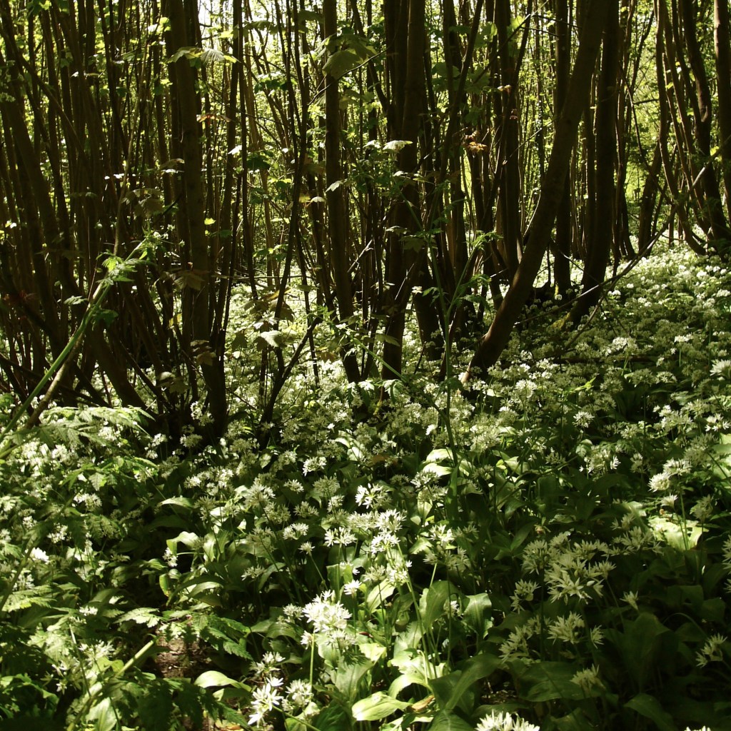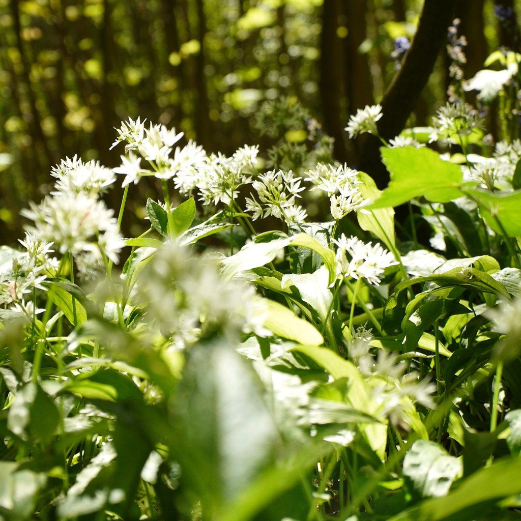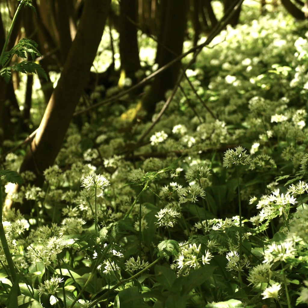 The well-used gravel track began to slope upward toward the awaiting hilltop. We walked past the farmyard of “Mote Farm”, where Beth stopped to read an information sign. The farm sells its produce locally, and as I had been looking for a more ethical source of meat, this seems like it could be a good option. The path continued to rise, and soon we found ourselves walking alongside one of the most notable Wild Garlic groves we have come across to date. I was very pleased to find it once again in full bloom. The sun shone down through the glowing leaves, and the ocean of white stars cascaded away beneath the trees as far as can be seen, as the scent wafted up on the warm air. The grove is long and deep, and made me want to be a fox or a badger for the day so that I could follow their little trails and walk amongst the galaxy of Wild Garlic flowers.